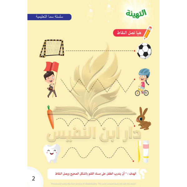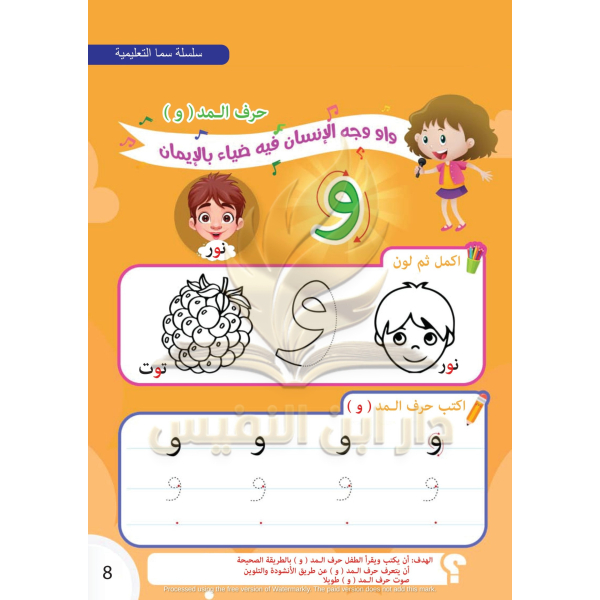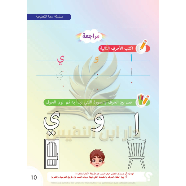كتاب سما العربية المستوى الأول يحوي في صفحاته الأولى العمل على تهيئة الطفل الإمساك بالقلم بالطرق الصحيحة والسليمة حتى نبدأ بتعليم الطفل كيفية إمساك القلم وبنفس الوقت الخط المتقطع ،حيث كتاب سما العربية المستوى الأول يحوي الخطوط المختلفة المستقيمة منها والمموجة والملتفة لتشجيع الطفل الوصول للهدف المطلوب ؛ ويلي ذلك صفحة للتلوين بالألوان الزاهية لتشجيع الطفل على التلوين داخل الرسمة المُعطاة ، ويلي ذلك درس في المهارات الحياتية وتعريف الطفل عن روضة جميلة ومرافقها وتعريف الطفل بأسماء المرافق واستخدام كل مرفق ومن ثم تعريف الطفل بأفراد أسرته ؛ ثم يلي ذلك معرفة الطفل بأجزاء جسمه ويلونها بألوانها الرائعة ؛وبعدها نبدأ بأحرف المد ( ا ؛ و؛ ي )، كما يركز كتاب سما العربية المستوى الأول على لفظها وأن يكون صوتها طويلاً ،كما يحوي على رسومات تحوي حروف المد والتركيزعلى لفظ حروف المد وكتابتها بطريقة صحيحة وسليمة ؛ وما يميز كتاب سما العربية أنه وضع جميع الحروف على شكل أناشيد مستوحاه من برامج الأطفال وبالأخص أن الطفل في هذه المرحلة يخرج من بيئته المنزلية الى بيئة روضته الجميلة ،وحتى نشجعه على التعلم لكل حرف في العربية من خلال شكله وصوته ساكناً، فقد أحتوى كتاب سما العربية المستوى الأول على بعض الدروس من المهارات الحياتية حتى لا يشعر الطفل بالملل.