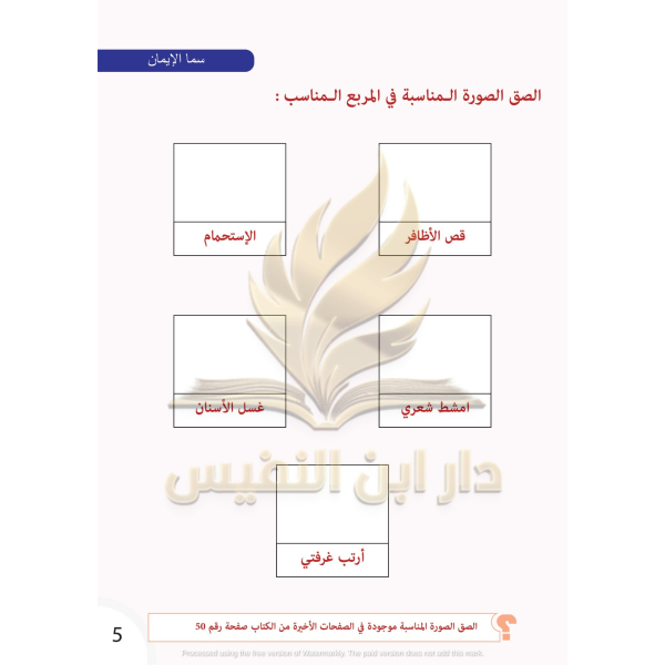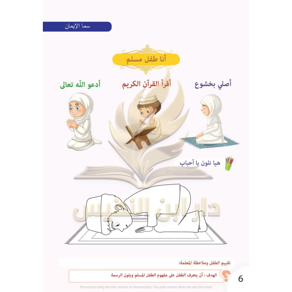 ويؤكد كتاب سما الإيمان أن النظافة من الإيمان ، ومن ثم يشرح للطفل خطوات الوضوء، ويركز على مفهوم بر الوالدين ، وتعليم الطفل تحية الإسلام الصحيحة و وعلى حفظ أركان الإسلام ومعرفة كل ركن من الأركان على حِدة ، وتطرق للصلوات الخمس في اليوم والليلة ، كما تطرق لبعض السور القرآنية كسورة الكوثر و سورة الناس وسورة الفيل وسورة العلق وسورة قريش و سورة القدر وسورة الإخلاص ، وكذلك تطرق كتاب سما الإيمان مولد الرسول محمد صلى الله عليه وسلم ونِعم الله الكثيرة التي أنعم الله سبحانه وتعالى بها على الإنسان ، وذكر العديد من الأدعية ، وركز على مفاهيم مساعدة الجار والرفق بالحيوان وإماطة الأذى عن الطريق والغش وتقديم الهدايا وترشيد استهلاك الماء وعدم الإسراف فيه والتعاون والمشاركة و الاستغفار والصدق وصلة الرحم والسرقة، وأن المسلم يحتفل بعيدين هما عيد الأضحى وعيد الفطر.