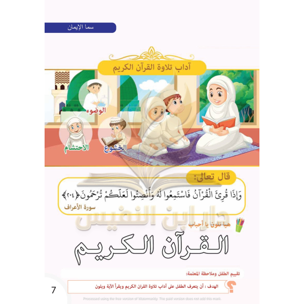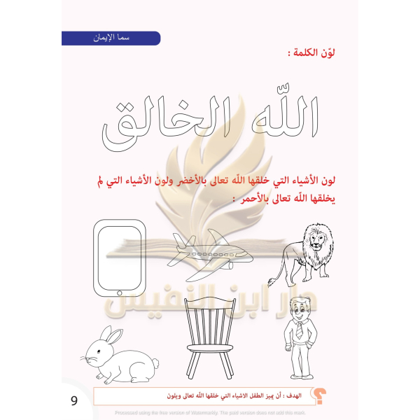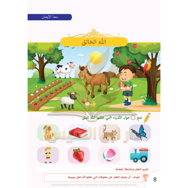 يحوي كتاب سما الإيمان على بعض القيم الدينية التي يجب على الطفل معرفتها ، حيث يبدأ كتاب سما الإيمان بسورة الفاتحة وآداب تلاوة القرآن الكريم ، ويؤكد للطفل مفهوم أن الله خالق كل شيء ، ثم يتطرق إلى تعريف الطفل بمفهوم البسملة.
